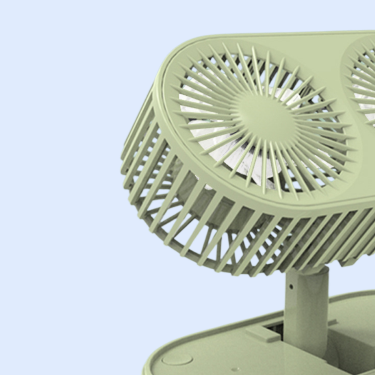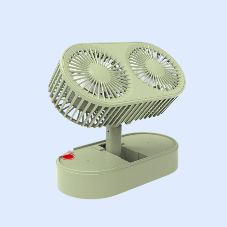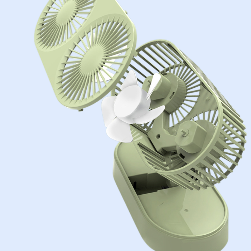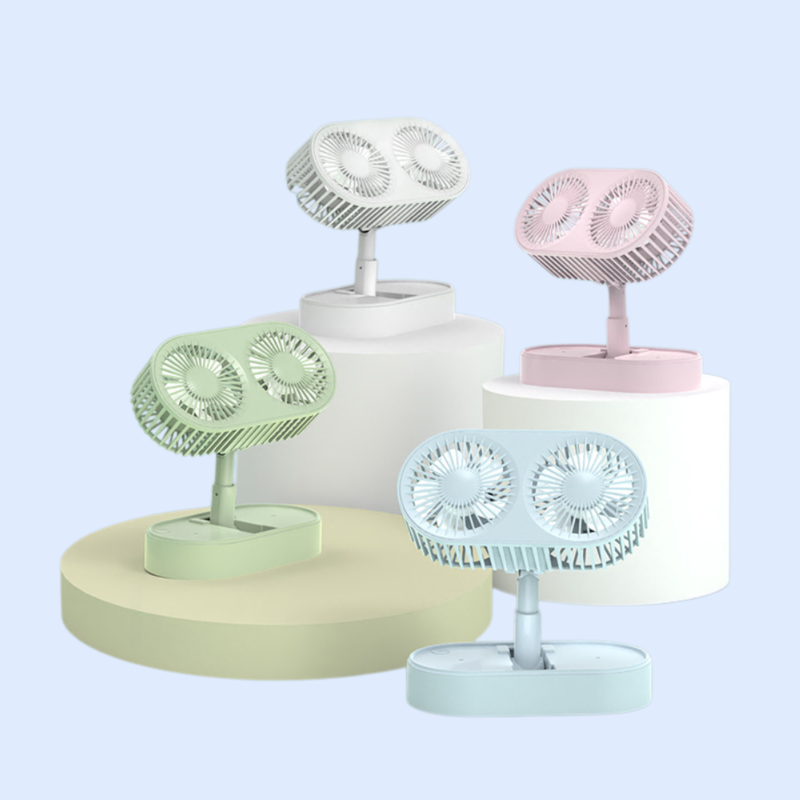 Anhebbarer, faltbarer Doppelkopf-Tischventilator mit zwei separat einstellbaren Köpfen, platzsparend klappbar, stufenlos höhenverstellbar, USB-betrieben, leise im Betrieb.